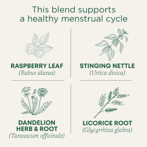 Elle est composée de plantes biologiques connues pour leurs bienfaits sur la santé des femmes : feuilles de framboisier, racine de réglisse, ortie, et pissenlit avec des notes d’agrumes et de menthe.